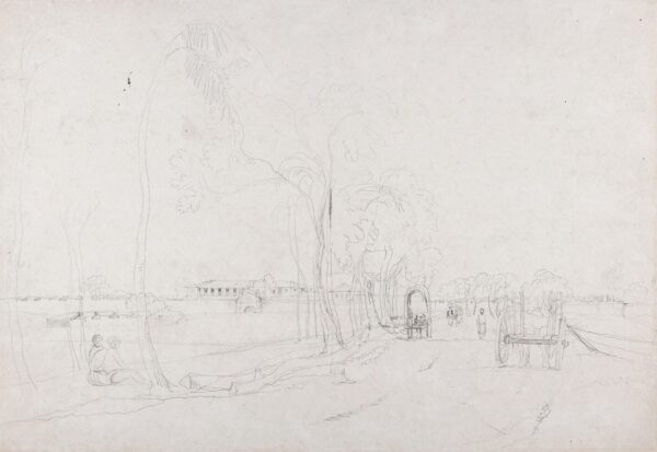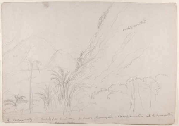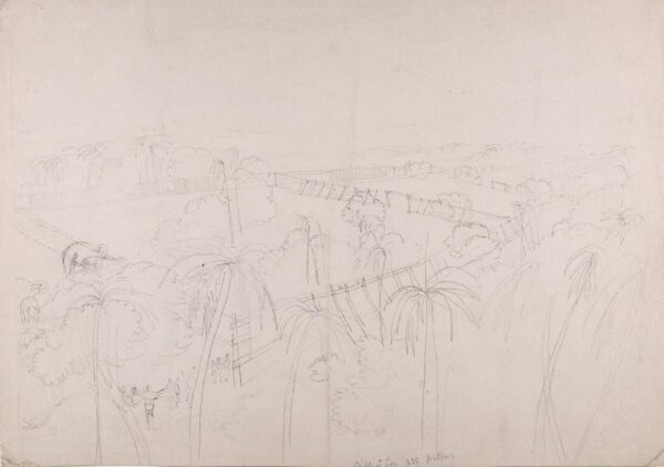 The man in between two palms in the lower left of the drawing is collecting toddy from the coconut inflorescences. Pencil. July 1848. Inscribed ‘Cribb & Son 288 Holborn’. Provenance: the Emerson Tennant family, Co Fermanagh, and by descent.