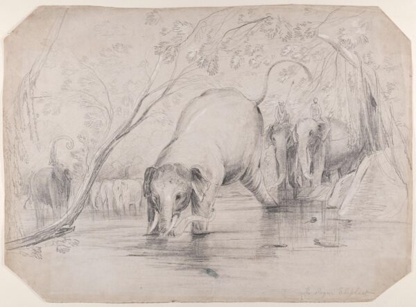‘Raja elephant’ usually refers to an elephant belonging to the Dalada Maligawa in Kandy who carries the sacred tooth relic of Lord Buddha in the procession. So this is likely Kandy Lake with elephants belonging to the Kandy temple. Pencil. July 1848. Provenance: the Emerson Tennant family, Co Fermanagh, and by descent.