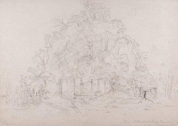 The Lowamahapaaya Temple (Lowa, “metal”. Maha paaya, “huge building”) was a nine-story building built by King Dutugemunu in the 5th Century that housed Buddhist monks. On the floor are scattered Guard Stones suggesting this was the main entrance. Pencil. Inscribed and dated, ‘July 22 1848’. Provenance: the Emerson Tennant family, Co Fermanagh, and by descent.