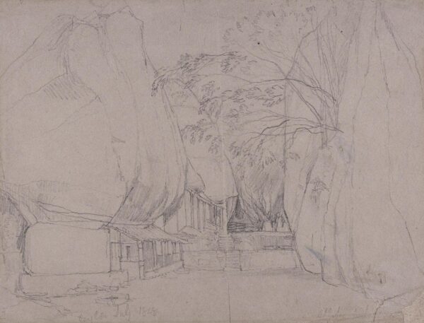 This is the cave where King Walagamba sheltered while escaping from Indian/Tamil invaders (103BC). It was later turned into a temple. Pencil. Inscribed ‘Ceylon’ and dated, ‘July 1848’. Provenance: the Emerson Tennant family, Co Fermanagh, and by descent.