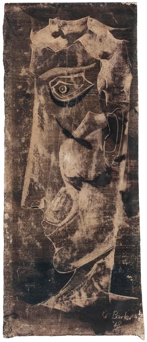 Barker, Kit (1916 – 1988)Cornwall; ‘Head of a Poet’.Wax-etching (monotype). 1948. Signed and dated. Provenance: the artist’ family, by descent.11×4.75 inches.Framed: 17.5×11 inches.