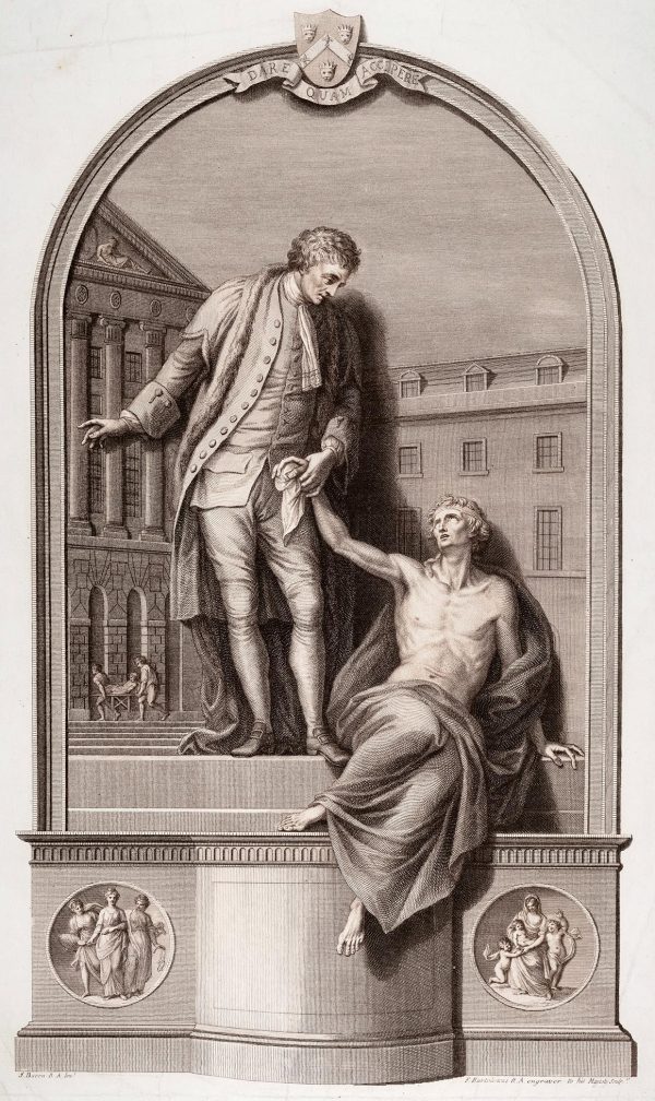 Bartolozzi, Francesco (1727 – 1815)‘Thomas Guy Memorial, at Guy’s Hospital: To Give, Rather Than To Receive’.Engraving. 1779. Made by Francesco Bartolozzi (1728-1815) after the sculpture by John Bacon (1740-1799).19.25×11.25 inches.