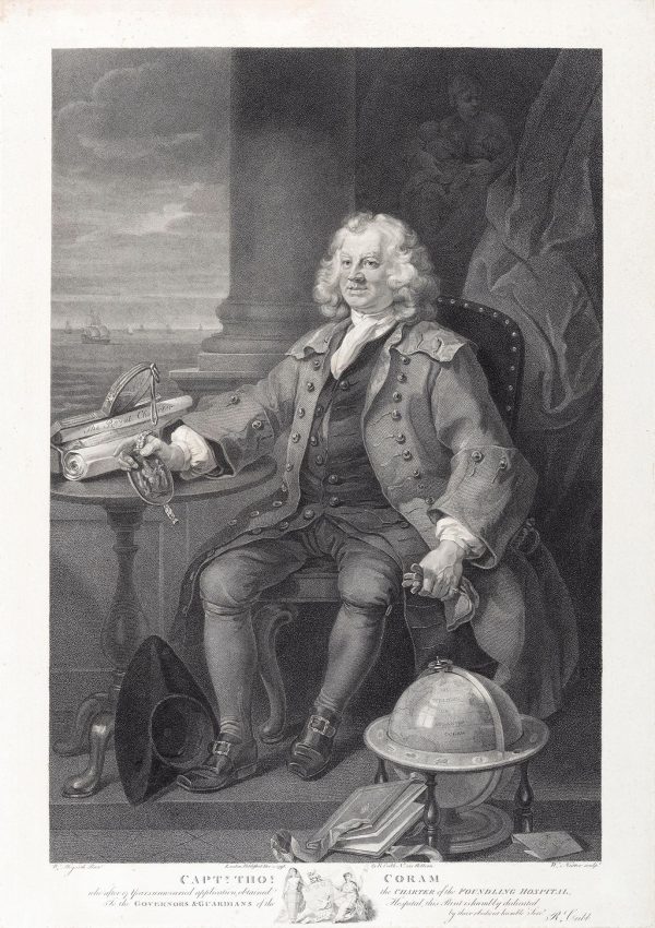 Hogarth (After), William (1697 – 1764)Captain Thomas Coram (c.1668-1751)‘ … who after 17 years unwearied application, obtained the Charter of the Foundling Hospital. To the Governors & Guardians of the Hospital, this Print is humbly dedicated / by their obedient humble Servt / R. Cribb’. Engraving. 1796. Engraved by William Nutter (1758/9-1802) after Hogarth’s 1740 portrait (Foundling Museum). Published by Robert Cribb (1755-1827).23×16 inches.Framed: 27.25×20.5 inches.