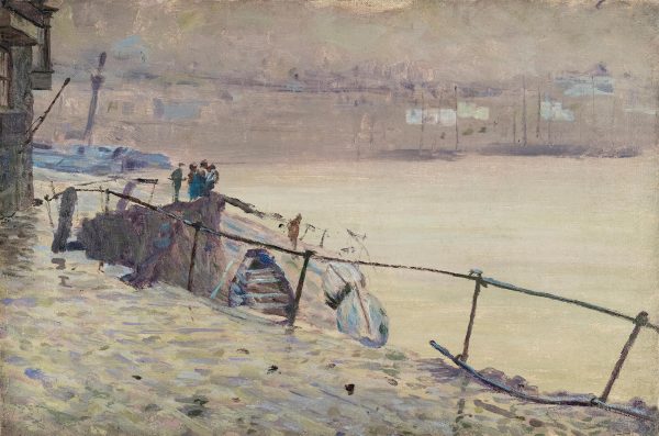 Hunter RBA, George Sherwood (1846 – 1919)Cornwall; A Harbour (probably Newlyn) at dawn.Oil on canvas. Provenance: the Artist’s studio sale.11.5×17.5 inches.Framed: 14×20 inches.