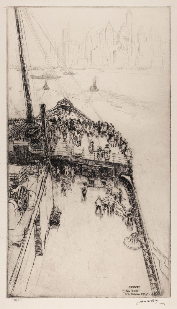 McBey, James (1883 – 1959)U.S.A.; ‘Approaching New York No.2’.Etching. 1934. Signed and numbered XLIII.15×8.5 inches.