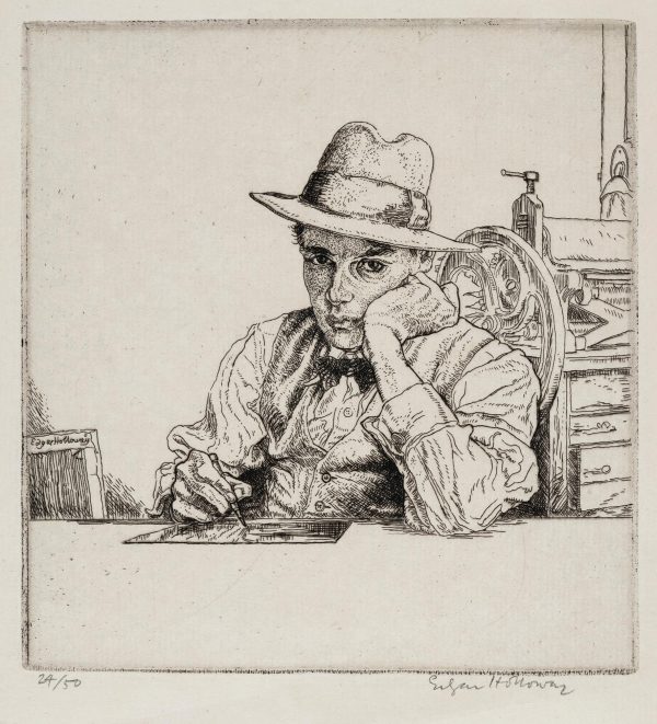 Holloway, Edgar (1914 – 2008)‘The Etcher No.18 (The Etcher II)’ (M.239); a self-portrait of the artist at work.Etching. From the 1979 reworking of the 1932 plate. Signed and numbered 24/50.5.25×5 inches.