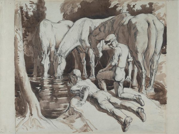 Dearden, Harold (1888 – 1962)Farm hands and horses at a watering hole.Pencil, pen, ink and monochrome wash. c.1930. Exhibited: Easthope & Fripp.15×20 inches.Framed: 17.5×22.5 inches.