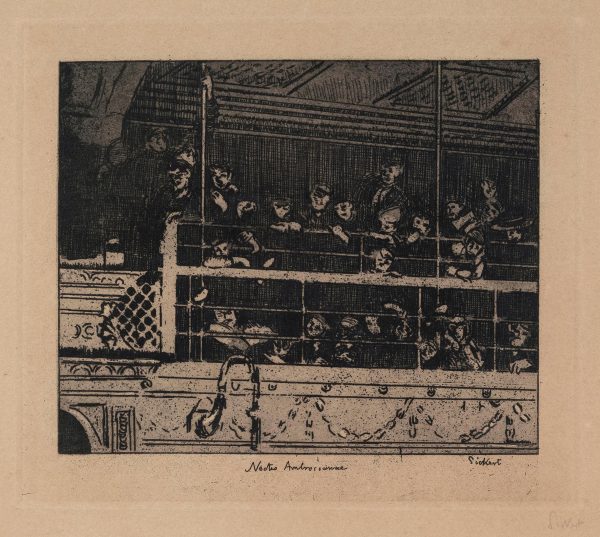 Sickert R.A. N.E.A.C., Walter Richard (1860 – 1942)‘Noctes Ambrosianae’ (B.129); the Middlesex Music Hall, Drury Lane, London.Etching and aquatint. c.1908. A rare, pencil signed impression in the third (final) state. Edition of 50 numbered impressions, signed in the plate, with further unnumbered impressions, signed and unsigned.10×11.25 inches.Framed: 17.5×21.5 inches.