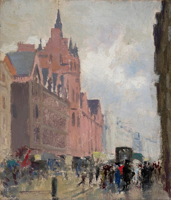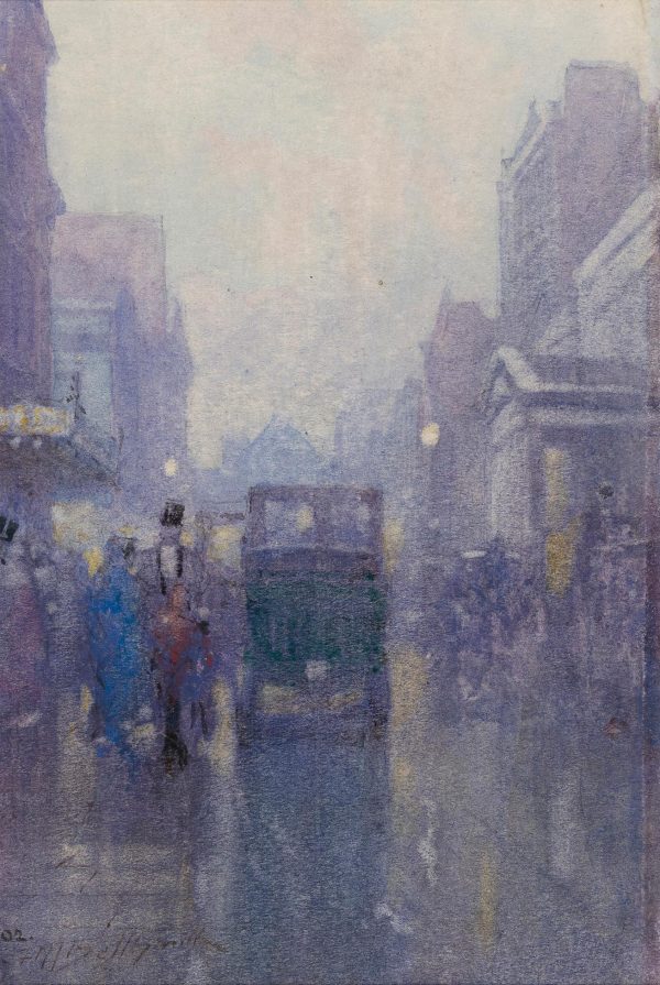 Bell-Smith O.S.A. R.C.A. S.C.A., Frederic Marlett (1846 – 1923)London; Holborn. The Prudential Assurance Building, AKA Holborn Bars.Oil on board. Signed. c.1910. Provenance: Canadian Fine Arts, Toronto; Masters Gallery, Toronto.5.25×4.5 inches.Framed: 9.5×9 inches.