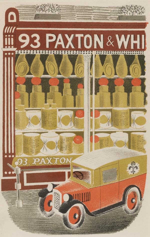 Ravilious, Eric (1903 – 1943)‘Cheesemonger’ (Paxton and Whitfield).Lithograph. c.1938. One of 24 lithographs made to illustrate J. M. Richards, ‘High Street’, Country Life, 1938. The lithographs were printed by the Curwen Press. Provenance: Goldmark Gallery.9×5.5 inches.Framed: 15×11.5 inches.
