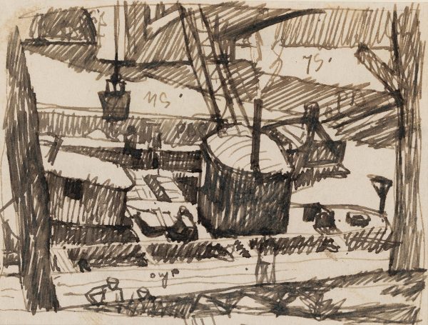 White N.E.A.C. R.W.S. L.G. S.W.E., Ethelbert (1891 – 1972)France; Paris, Barges on the Seine.Pen and ink. c.1912. Provenance: the artist’s family; Denis Wilcox / The Court Gallery; Private Collection.3×4.25 inches.Framed: 5×6 inches.