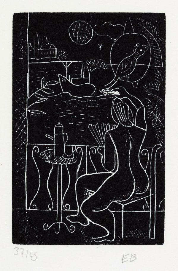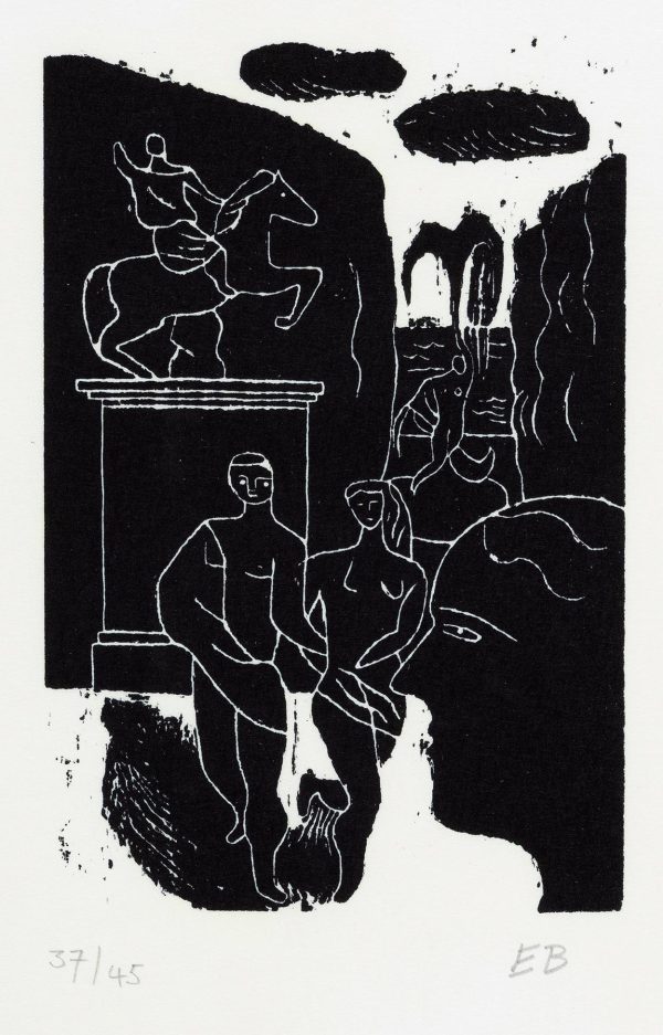 Burra, Edward (1905 – 1976)Nine Woodcuts; ‘Cup Bearer’.Woodcut. c.1929. Re-strike printed by Alexander Postan in 1971 from the original blocks. Published by Nicholas Treadwell in an edition of 45 and sold by Observer Art. The blocks were then given to the Tate.Framed: 15×12 inches.