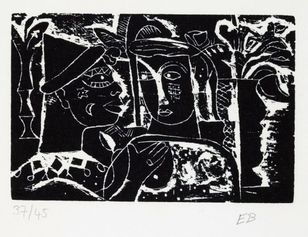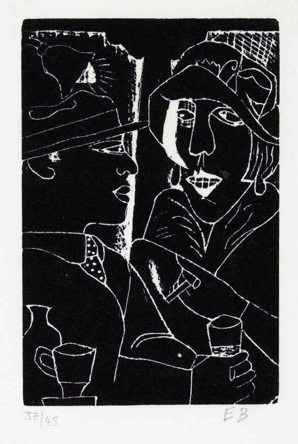 Burra, Edward (1905 – 1976)Nine Woodcuts; ‘Two at a Bar’.Woodcut. c.1929. Re-strike printed by Alexander Postan in 1971 from the original blocks. Published by Nicholas Treadwell in an edition of 45 and sold by Observer Art. The blocks were then given to the Tate.Framed: 15×12 inches.