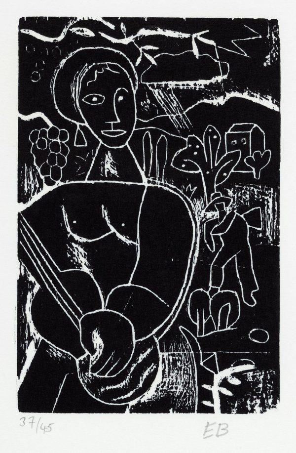 Burra, Edward (1905 – 1976)Nine Woodcuts; ‘Guitar Player’.Woodcut. c.1929. Re-strike printed by Alexander Postan in 1971 from the original blocks. Published by Nicholas Treadwell in an edition of 45 and sold by Observer Art. The blocks were then given to the Tate.Framed: 15×12 inches.