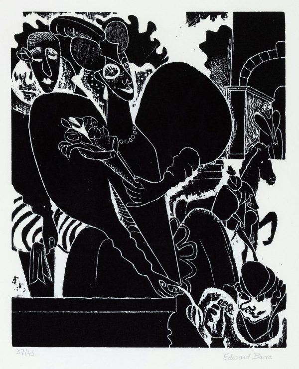 Burra, Edward (1905 – 1976)Nine Woodcuts; ‘Balcony’.Woodcut. c.1929. Re-strike printed by Alexander Postan in 1971 from the original blocks. Published by Nicholas Treadwell in an edition of 45 and sold by Observer Art. The blocks were then given to the Tate.Framed: 15×12 inches.