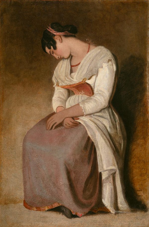 Severn, Joseph (1793 – 1879)Elizabeth Severn (Nee Montgomerie) (1803-1862), the artist’s wife, in Italian costume.Oil on paper laid to canvas. Signed and inscribed ‘Eliza Severn / Rome 1837’. This work closely relates to a group of three paintings by Severn in the Royal Collection.15.5×10.25 inches.Framed: 20.5×15.25 inches.