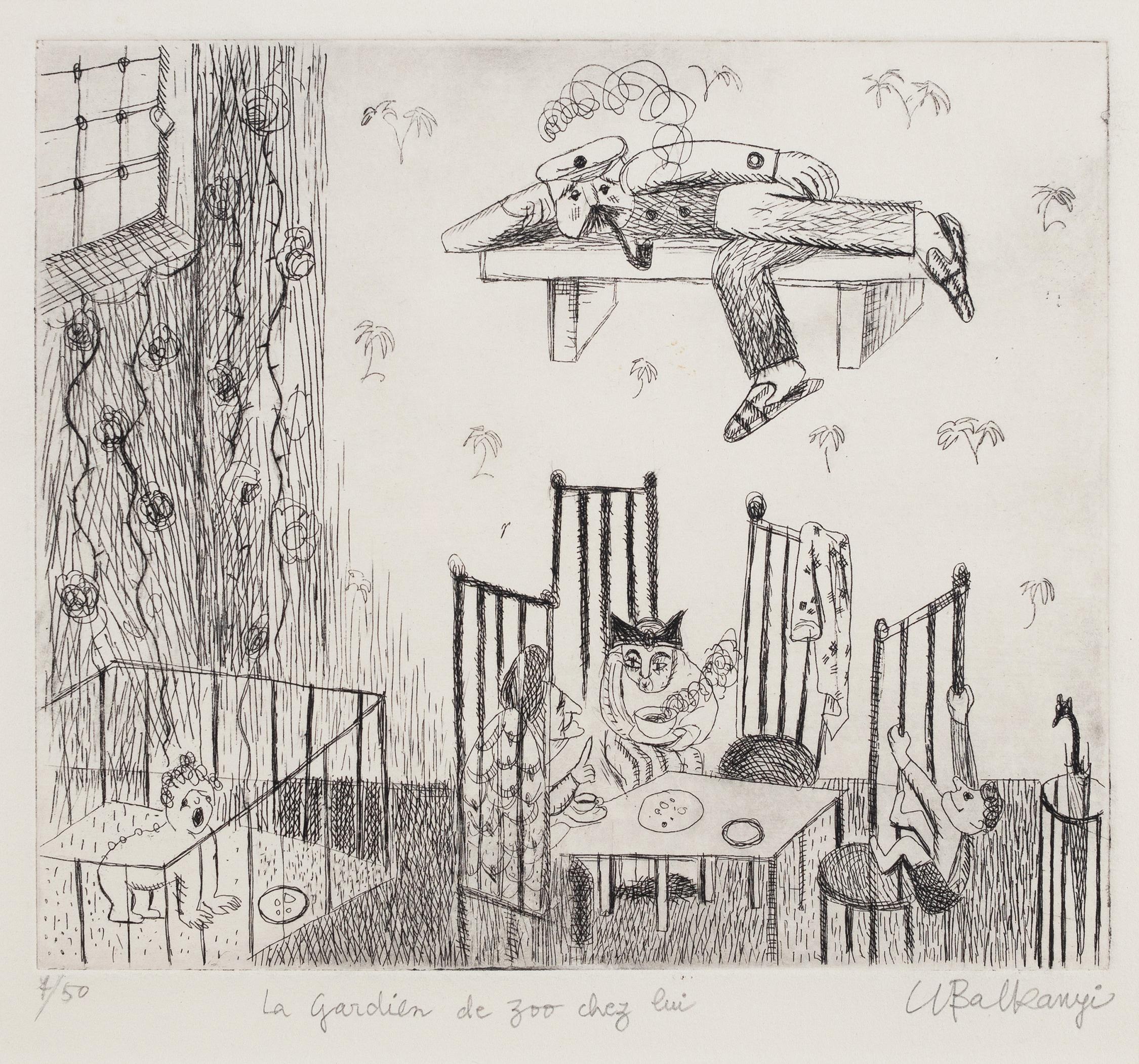 Balkanyi, Suzanne (1922 – 2005) – Le Gardian de Zoo Chez Lui. Balkanyi, Suzanne (1922 - 2005) Le Gardian de Zoo Chez Lui. Etching. Signed, inscribed and editioend '7/50'. 6x7 inches. Framed: 15x15 inches. Sold Favourite