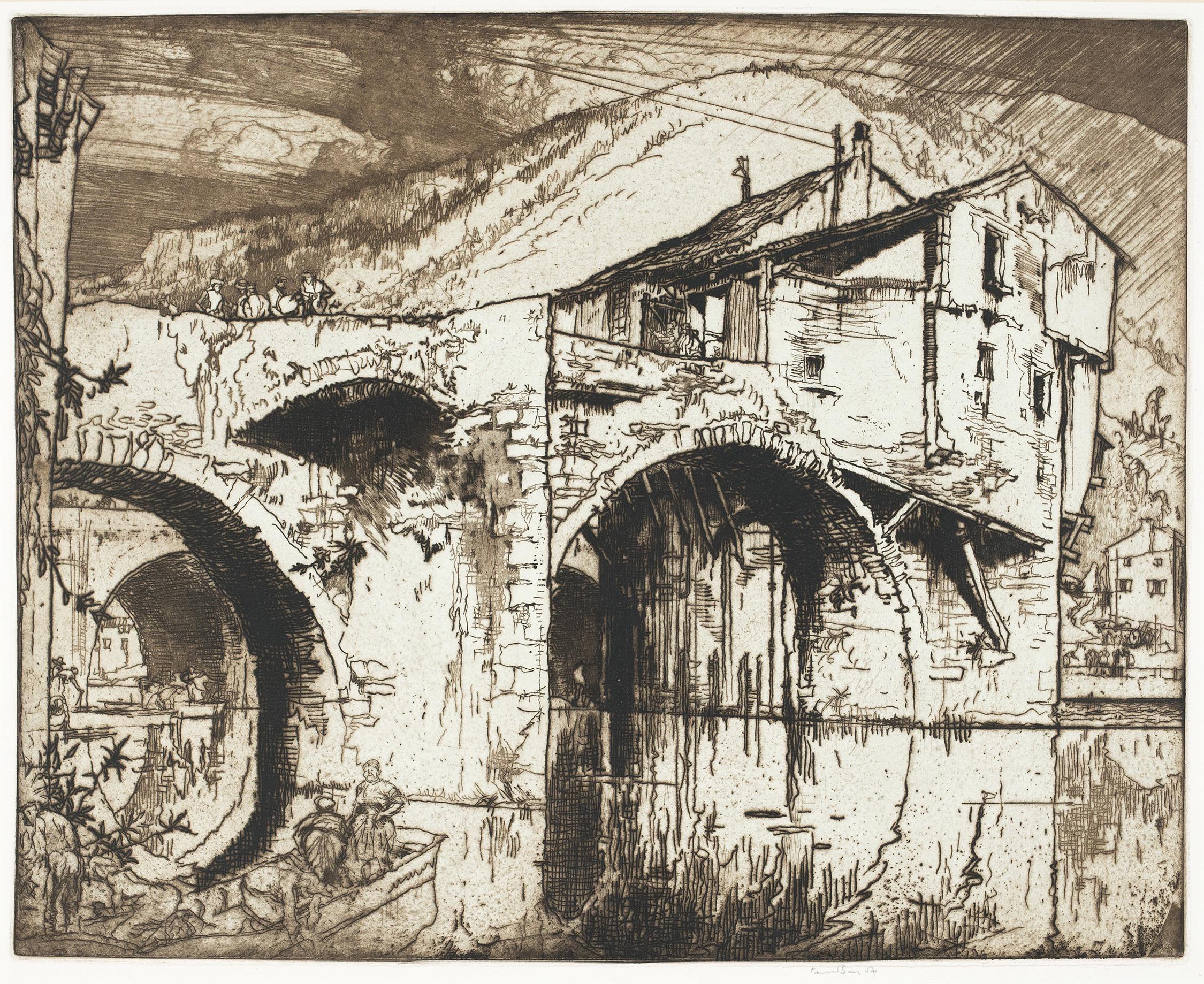 Brangwyn R.A. R.W.S., Frank (1867 – 1956) – France; ‘The Bridge at Millau’ (Gaunt 250). Brangwyn R.A. R.W.S., Frank (1867 - 1956) France; 'The Bridge at Millau' (Gaunt 250). Etching and aquatint. 1919. Signed. 19.5x24.5 inches. Sold Favourite See available works by this artist.