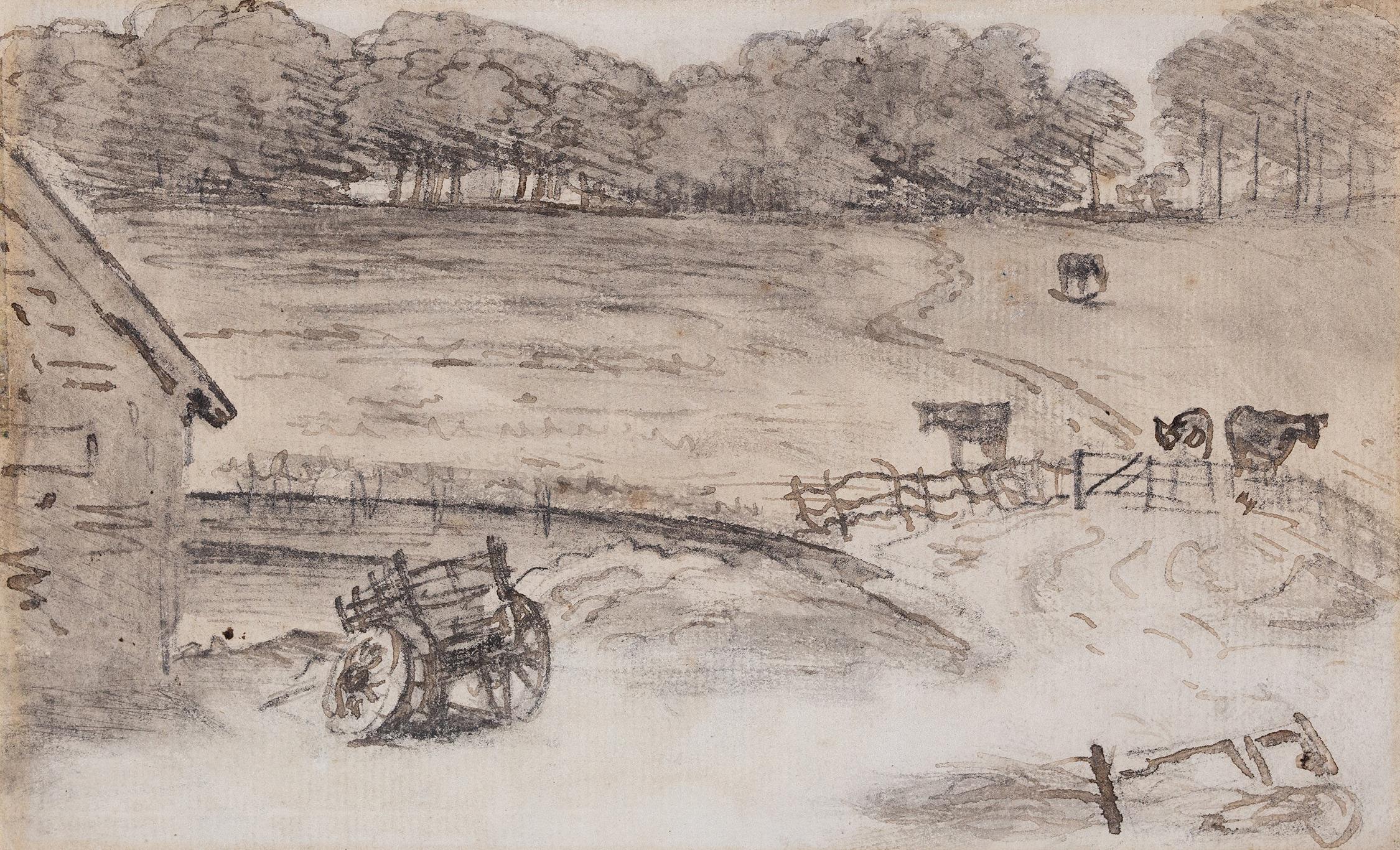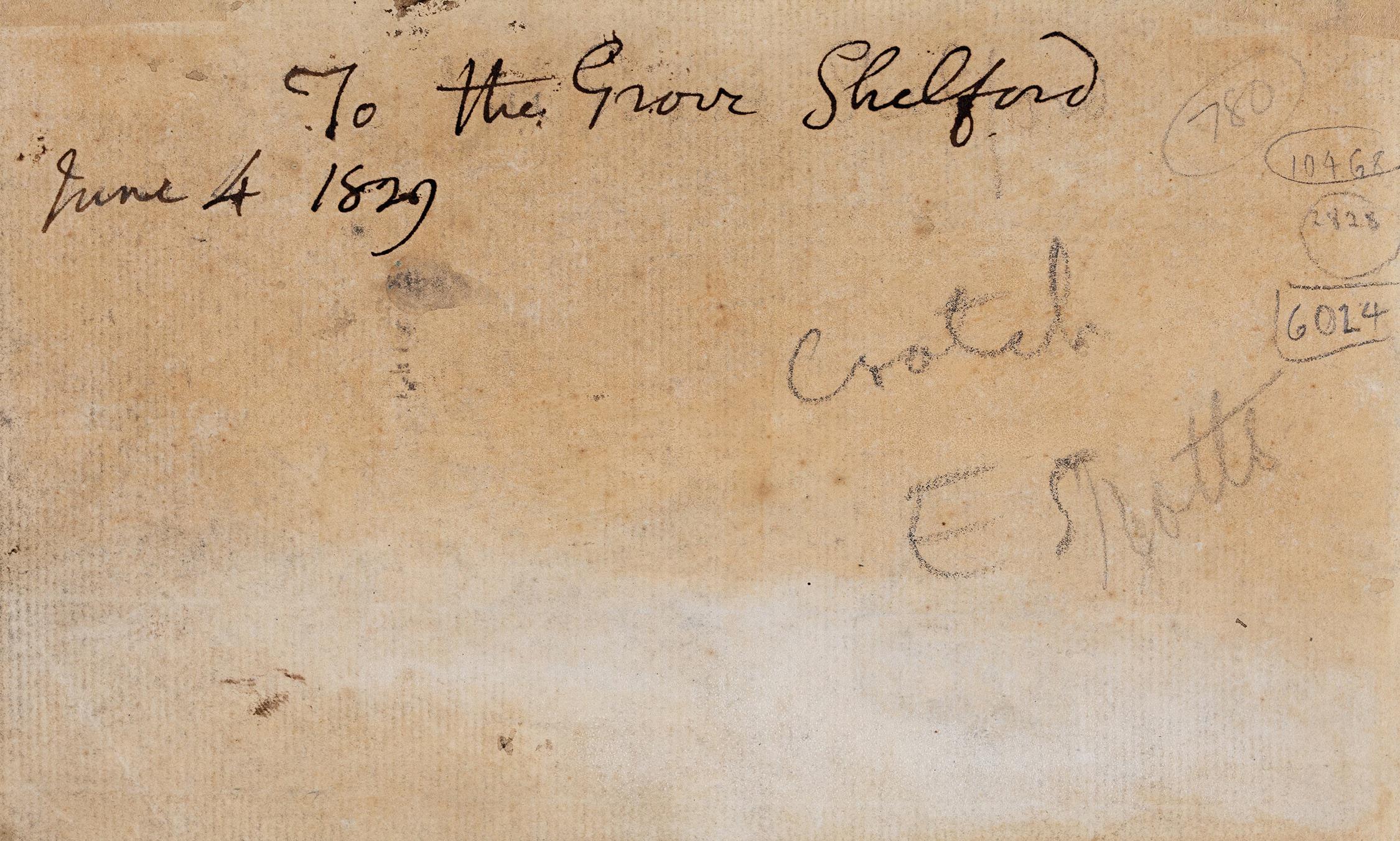 Crotch, Dr William (1775 – 1847) – Cambridgeshire; ‘To the Grove Shelford / June 4th 1829’. Crotch, Dr William (1775 - 1847) Cambridgeshire; 'To the Grove Shelford / June 4th 1829'. Pen, ink and monochrome wash. Inscribed and dated verso. 4x6.5 inches. Sold Favourite