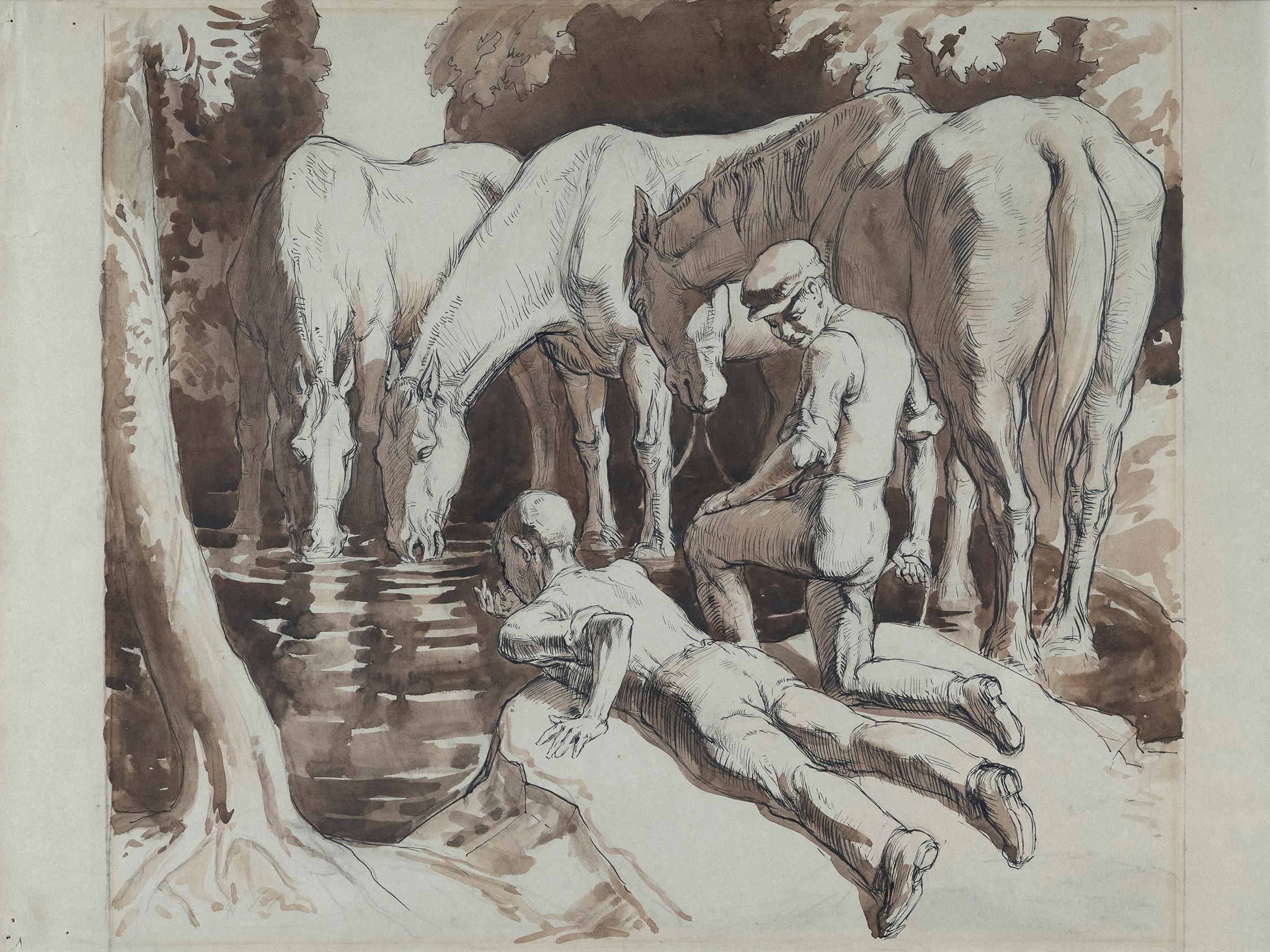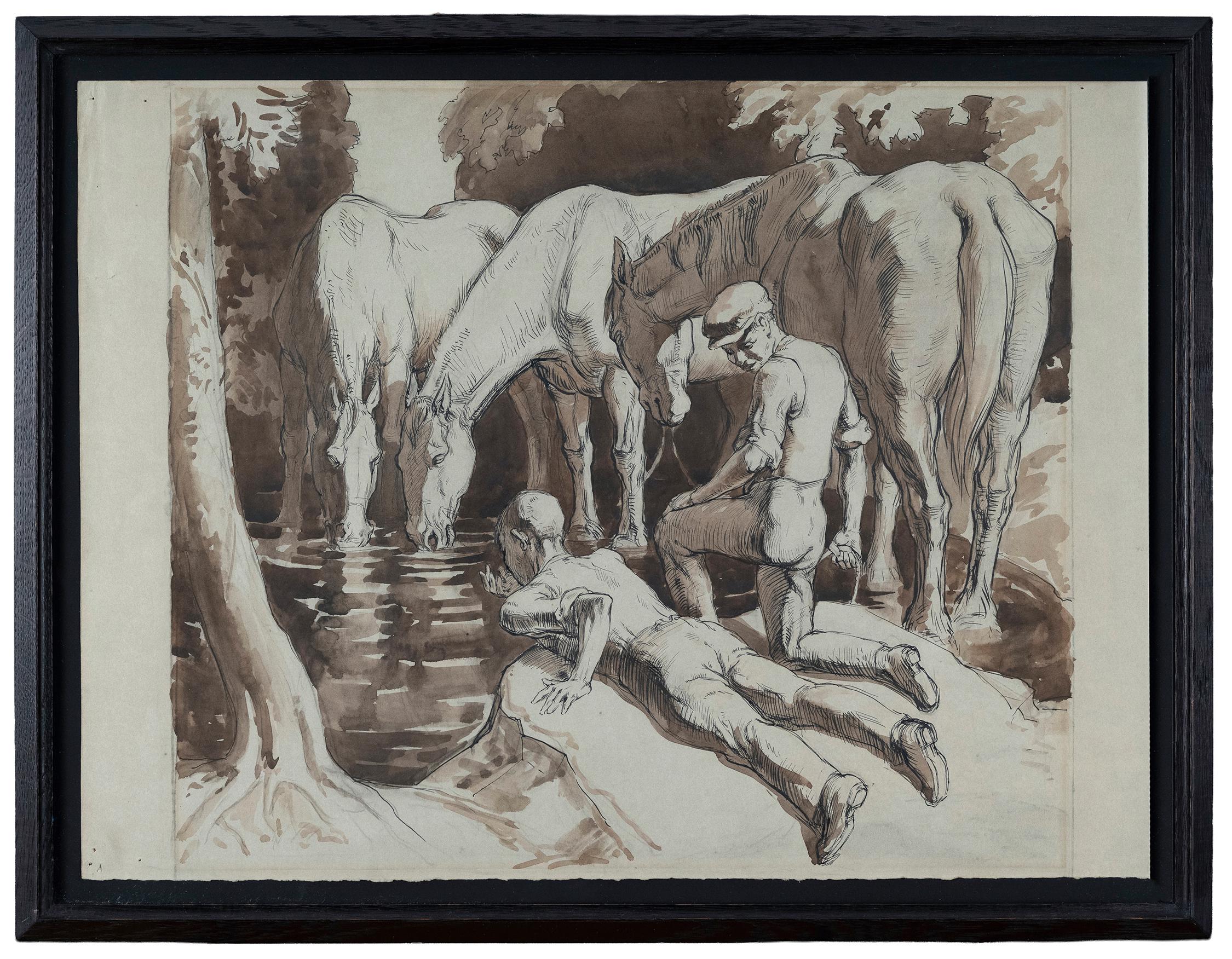 Dearden, Harold (1888 – 1962) – Farm hands and horses at a watering hole. Dearden, Harold (1888 - 1962) Farm hands and horses at a watering hole. Pencil, pen, ink and monochrome wash. c.1930. Exhibited: Easthope & Fripp. 15x20 inches. Framed: 17.5x22.5 inches. Sold Favourite