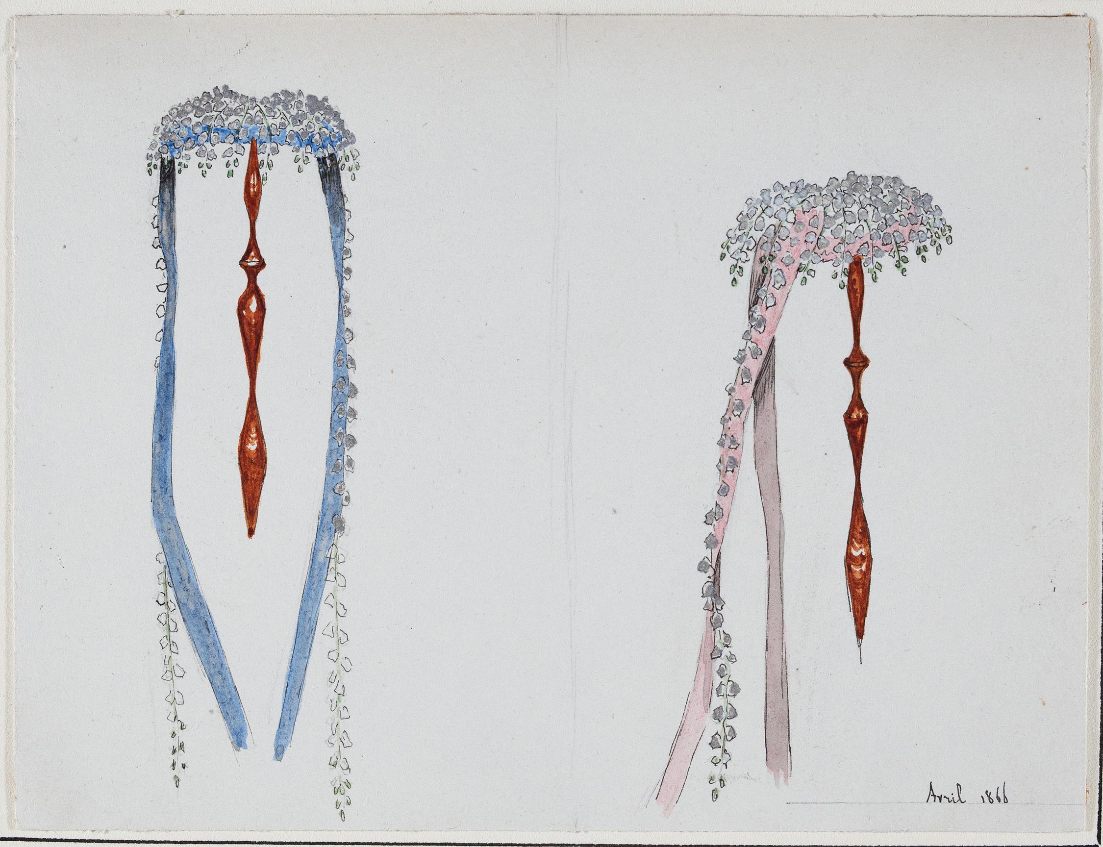 Felix (fl.1860s), Auguste – Headdress design. Felix (fl.1860s), Auguste Headdress design. Ink and watercolour. 1866. Provenance: Workshop of (Emile) Poirier, Modiste, 1860-1970, (rue de l'Ecole-de-Medecine, then rue de l'Ancienne-Comedie). 4x5.5 inches. Sold Favourite