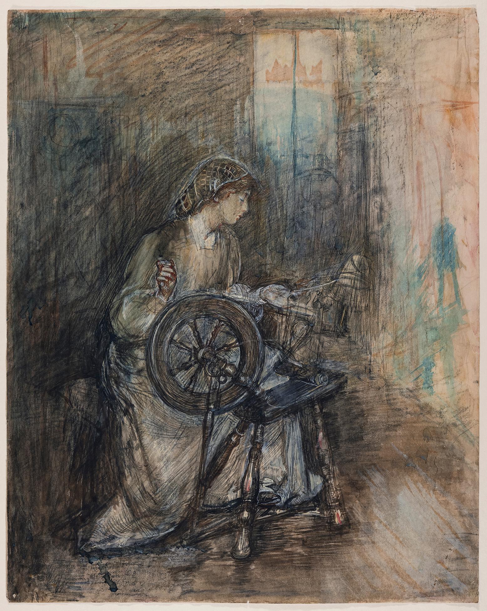 Woman at a spinning wheel, possible an illustration to Rumpelstiltskin by the Brothers Grimm.
