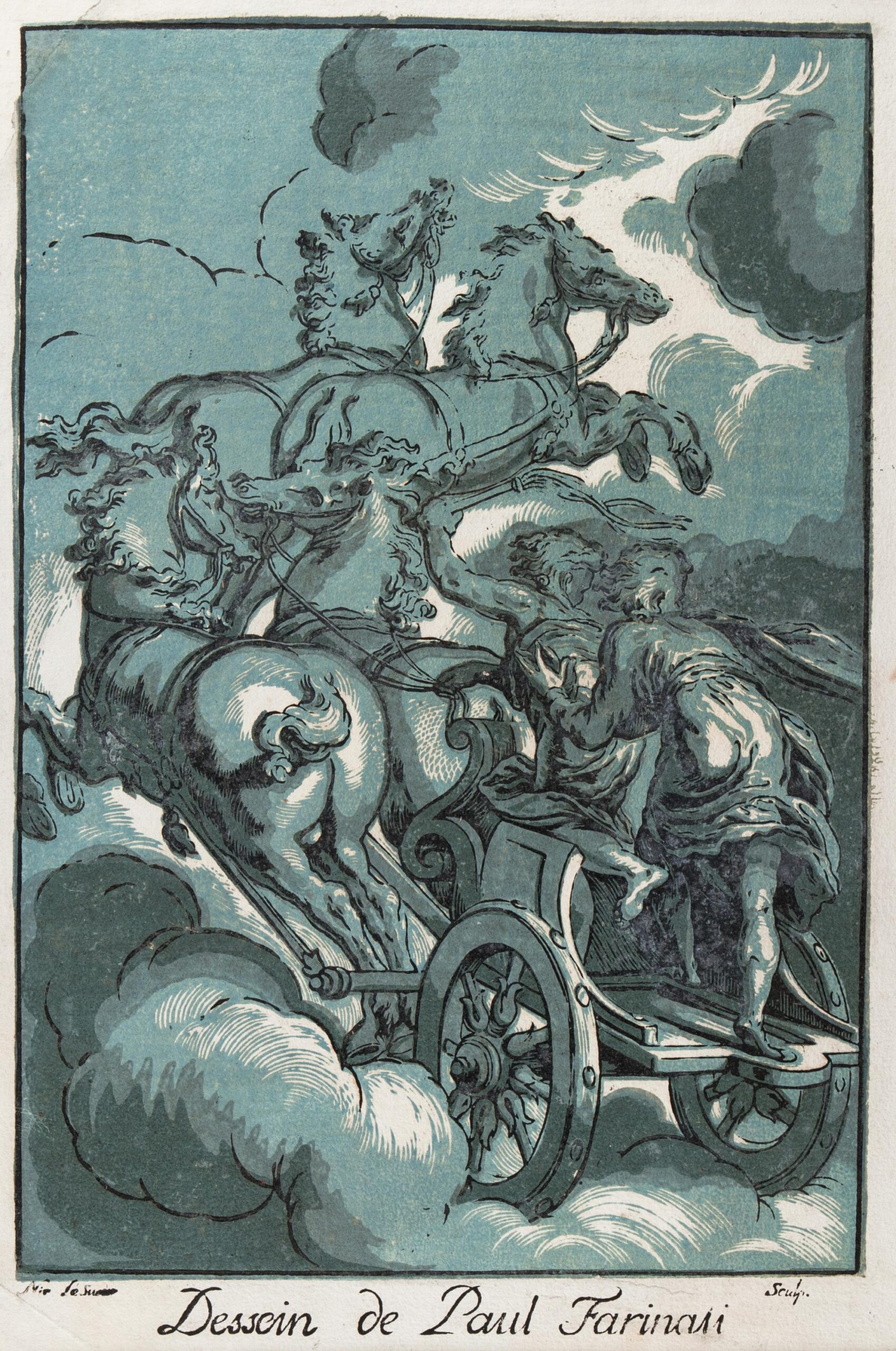 Le Sueur, Nicolas (1691 – 1764) – Dessein de Paul Farinti / Le Soleil dans son char. (Le Blanc 23). Le Sueur, Nicolas (1691 - 1764) Dessein de Paul Farinti / Le Soleil dans son char. (Le Blanc 23). Chiaroscuro wood-cut. 15.5x10.5 inches. Sold Favourite