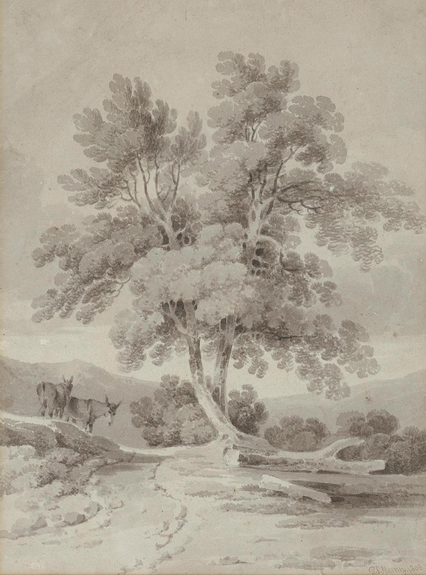 Munn, Paul Sandby (1773 – 1845) – A Welsh or Lakeland Tree … and Donkeys. Munn, Paul Sandby (1773 - 1845) A Welsh or Lakeland Tree ... and Donkeys. Pencil and monochrome wash. Signed and dated, 1808. 11x8 inches. Framed: 17.25x13.5 inches. Sold Favourite