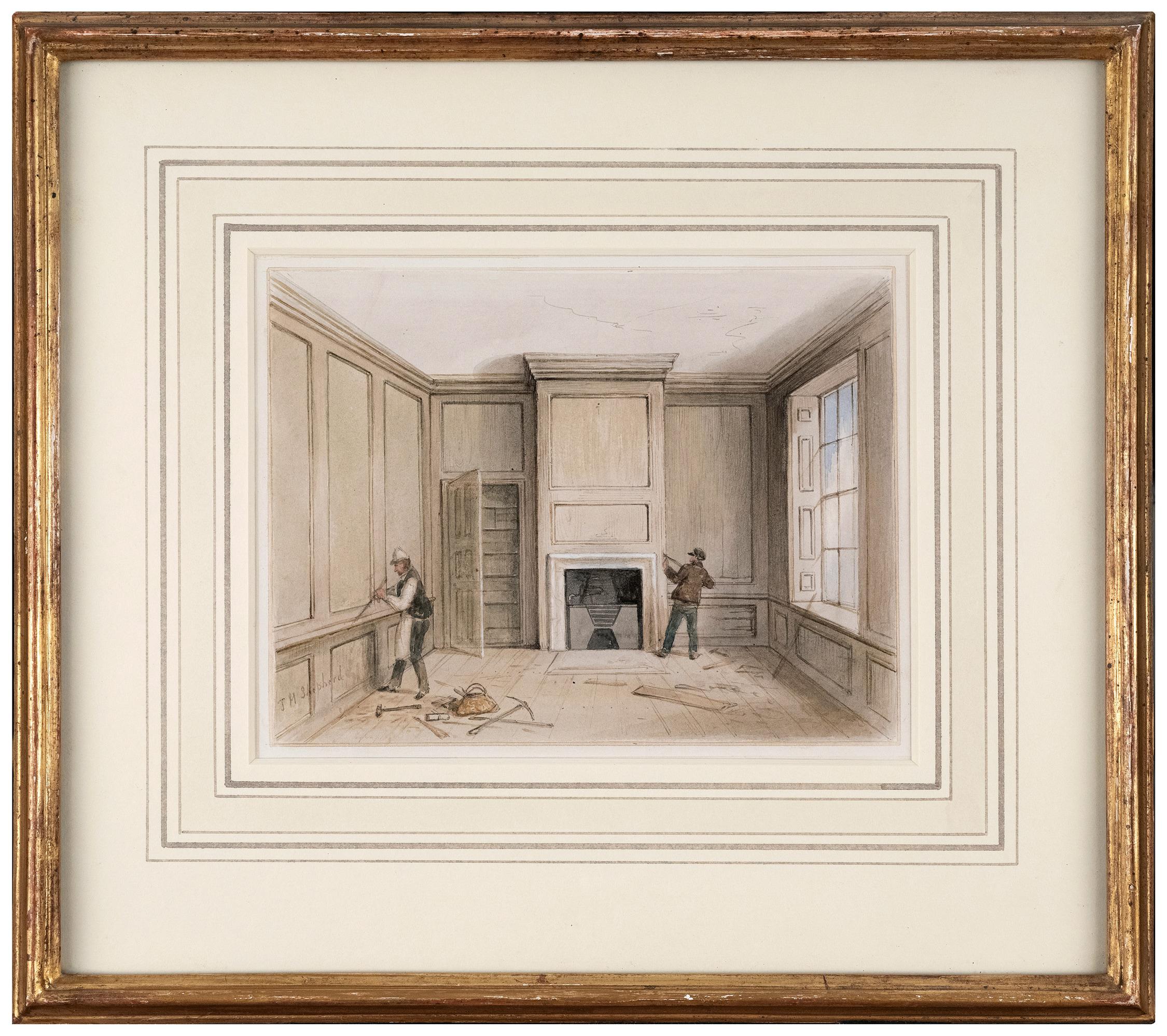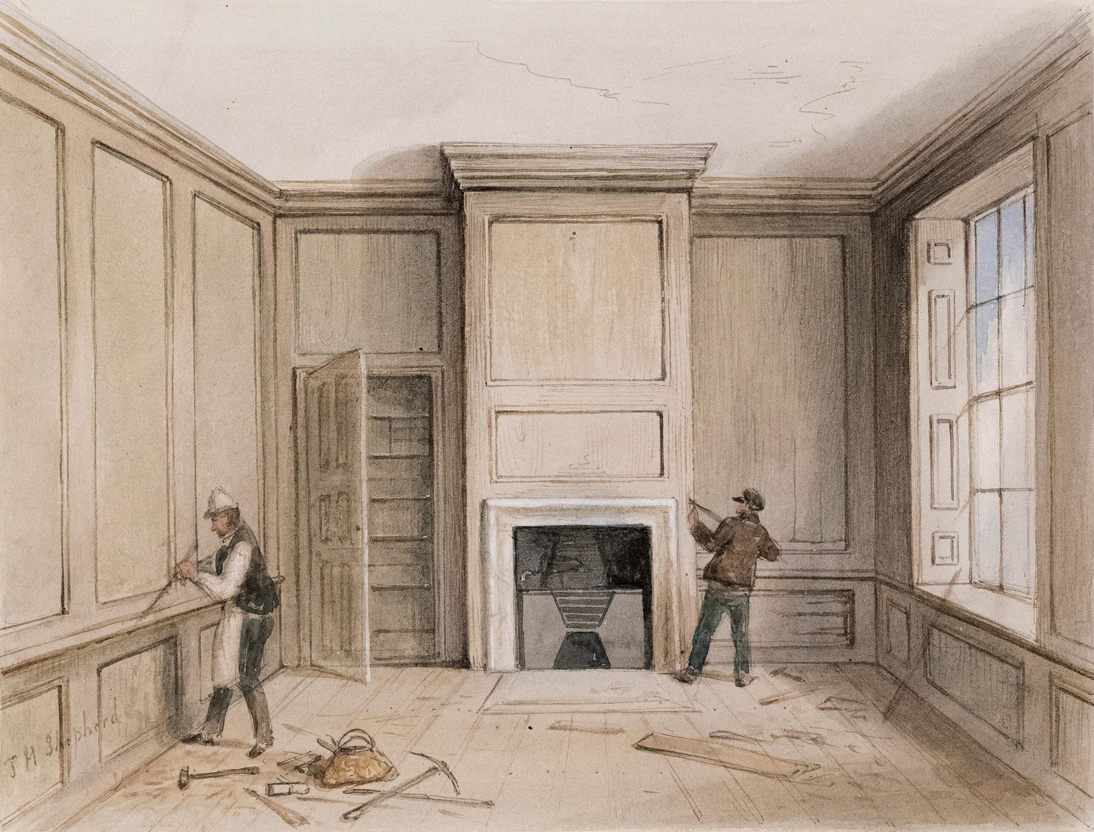 London; Abney House. Carpenters dismantling panelling before demolition.