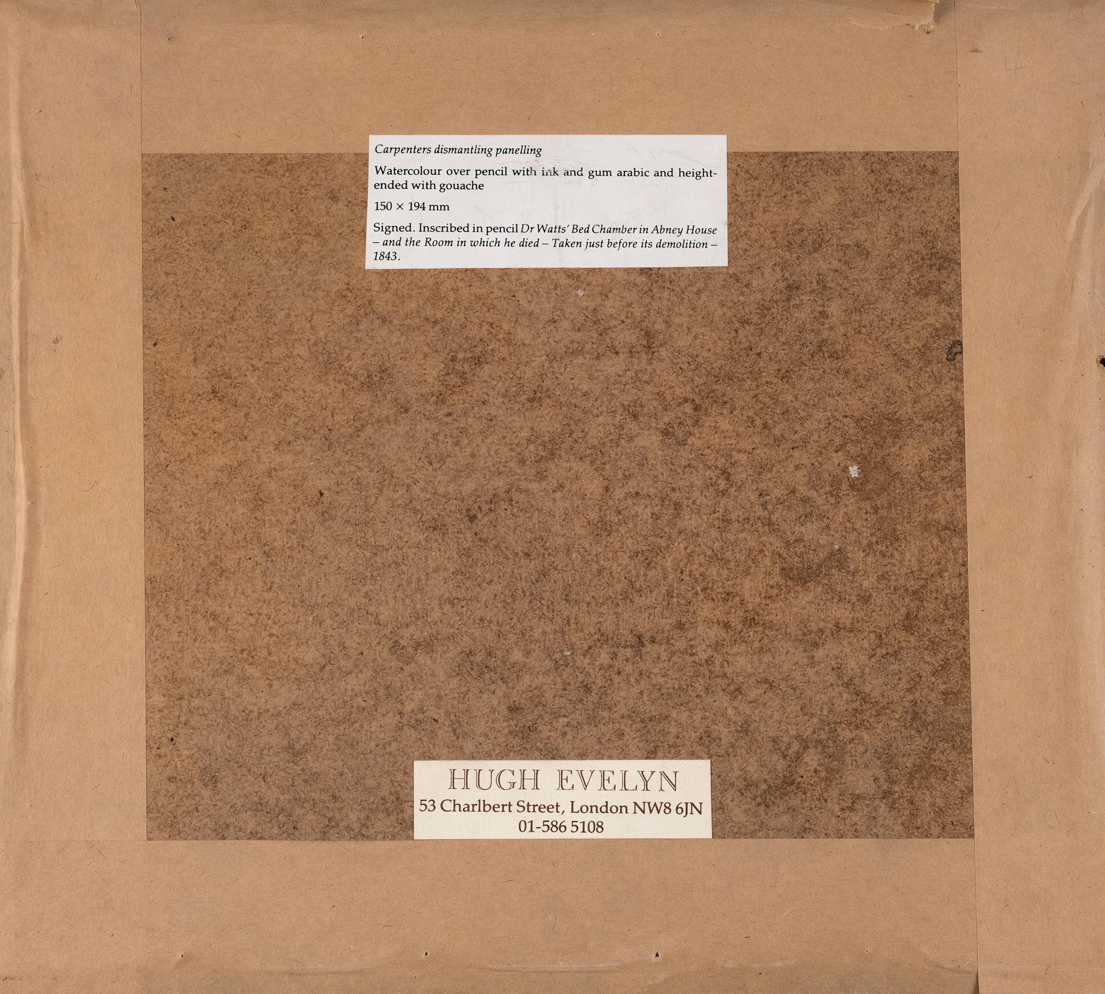 Pencil and watercolour. c.1843. Inscribed 'Dr Watt's Bed Chamber in Abney House - and the Room in which he dies - Taken just before its demolition - 1843'.