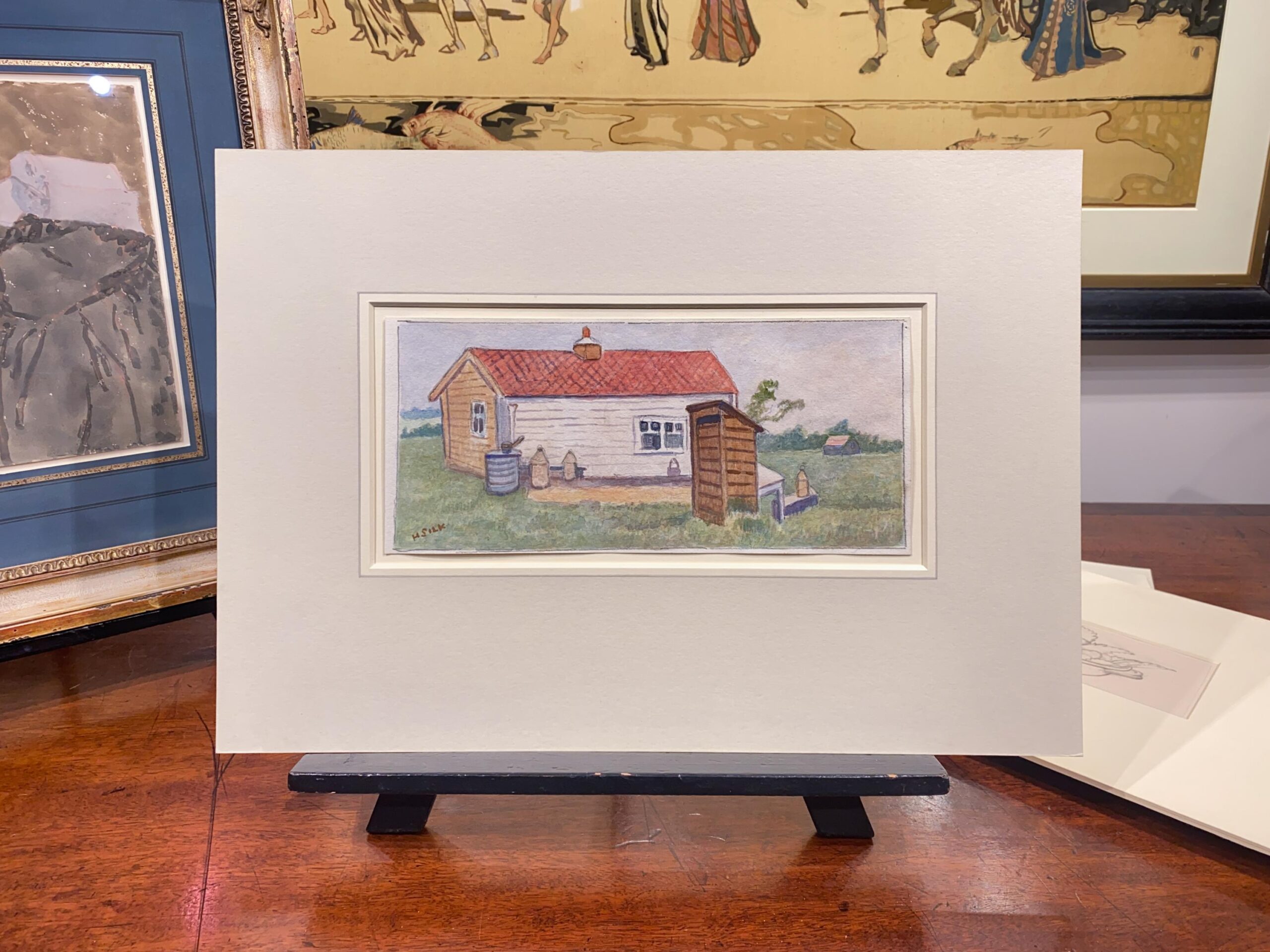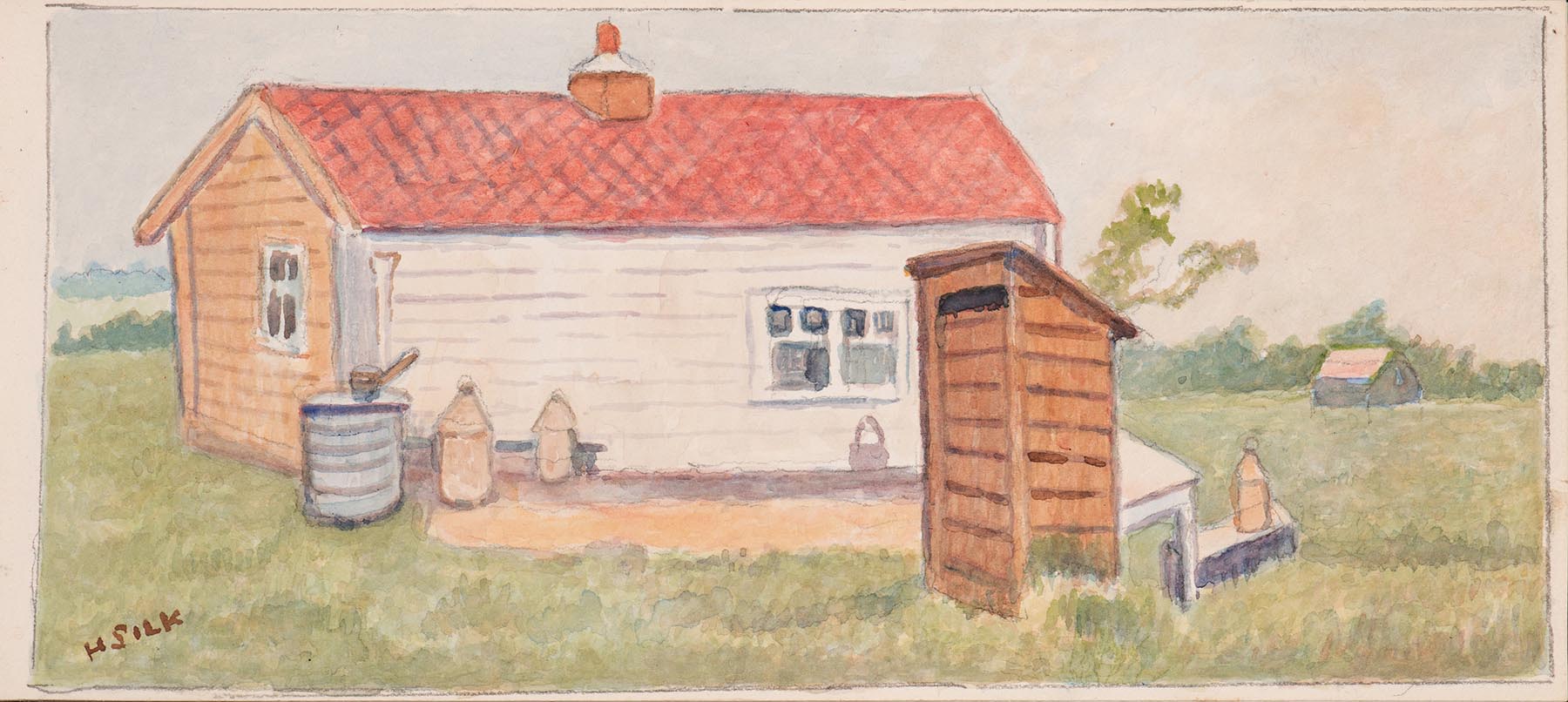Silk, Henry (1883 – 1947) – A farm worker’s hut. Silk, Henry (1883 - 1947) A farm worker's hut. Watercolour. Circa 1930. Provenance: Artist's family by descent. 4.5"x10" inches. Framed: 13.5"x18.5" inches. Sold Favourite