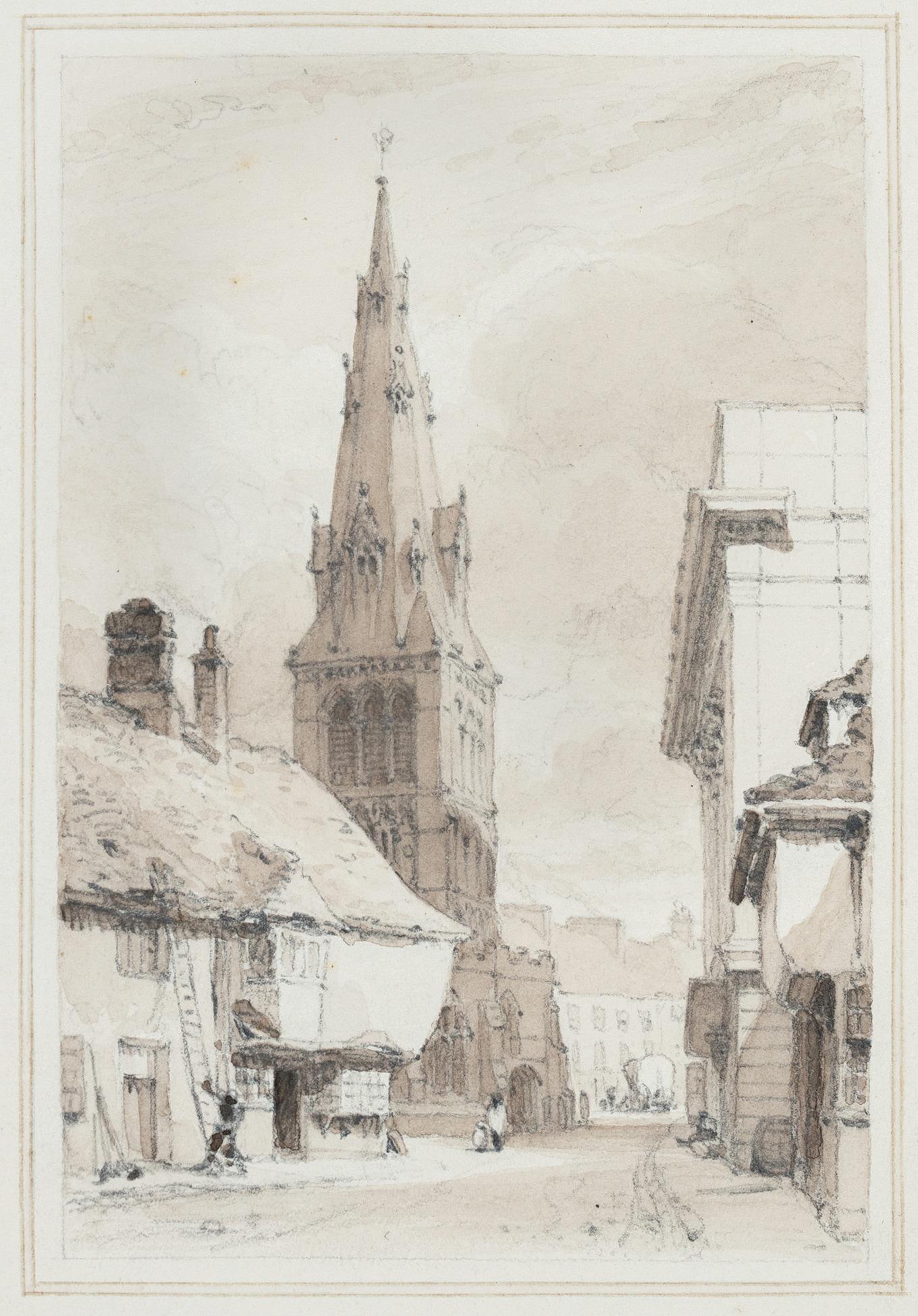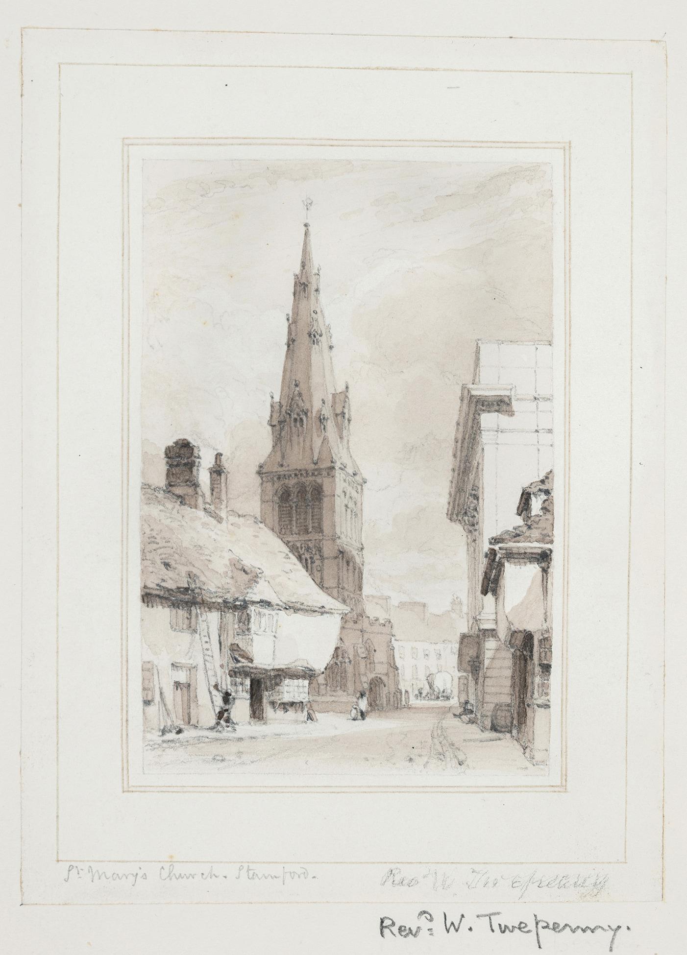 Pencil and sepia wash. Inscribed 'Rev. W Twopenny' (strengthened) and 'Rev. W Twepnenny' in a later hand. Although William Twopenny is known to have made many antiquarian drawings (the BM has a collection), he was a solicitor and not a Reverend. However, his brother the Rev. David Twopenny was also an amateur artist. David Twopenny married the youngest daughter of his uncle, the Rev. Richard Twopenny at Little Casterton, near Stanford, in 1834. Provenance: The Newall Collection, Christies, 13, 14 December 1979, Album, lot 249. Inscribed in the album 'From Miss Alleyne's Collection 1945'.